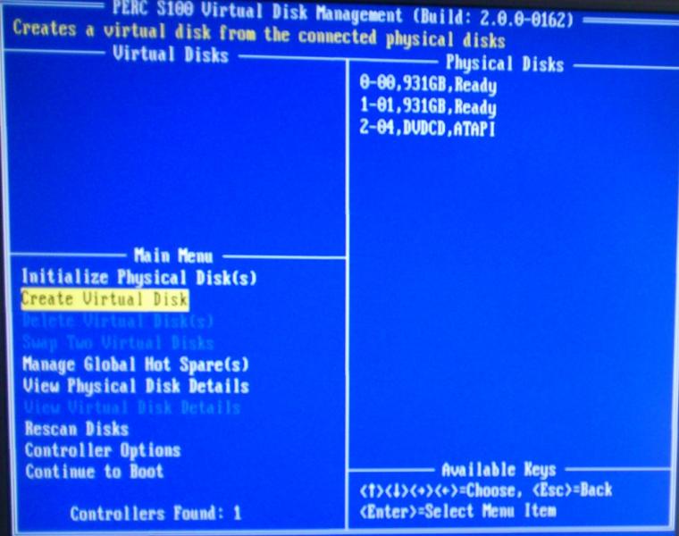 Si aparece algo diferente a la imagen, debemos eliminar la configuración actual, seleccionando la opción Delete Virtual Disks, y pulsando "A", para seleccionar los 2 discos y eliminarlos.