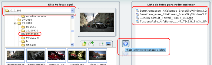 Pulsar el botón de la flecha para añadir las fotos seleccionadas a la lista para redimensionar